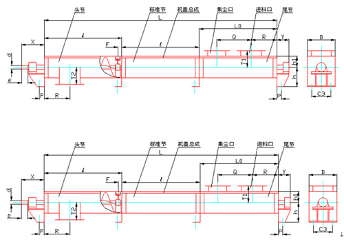 中的運(yùn)送_是一種滑移運(yùn)動(dòng),為了使螺旋軸處于較為有利的受拉狀態(tài),設(shè)計(jì)時(shí)將驅(qū)動(dòng)裝置和出料口安裝在輸送機(jī)的同一端,把進(jìn)料口放在尾部附近。